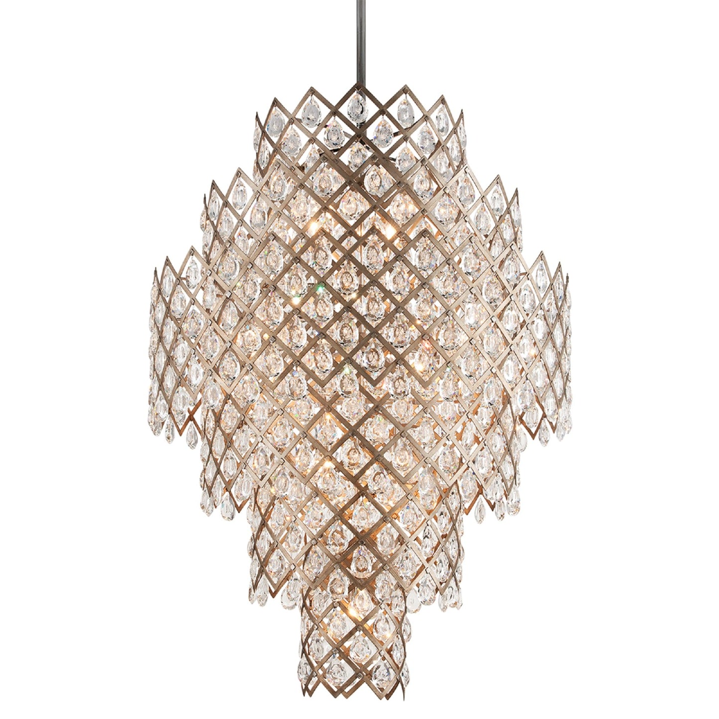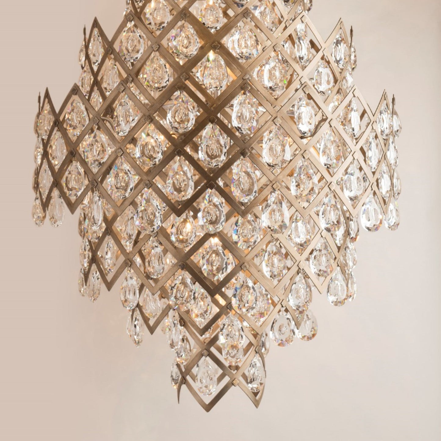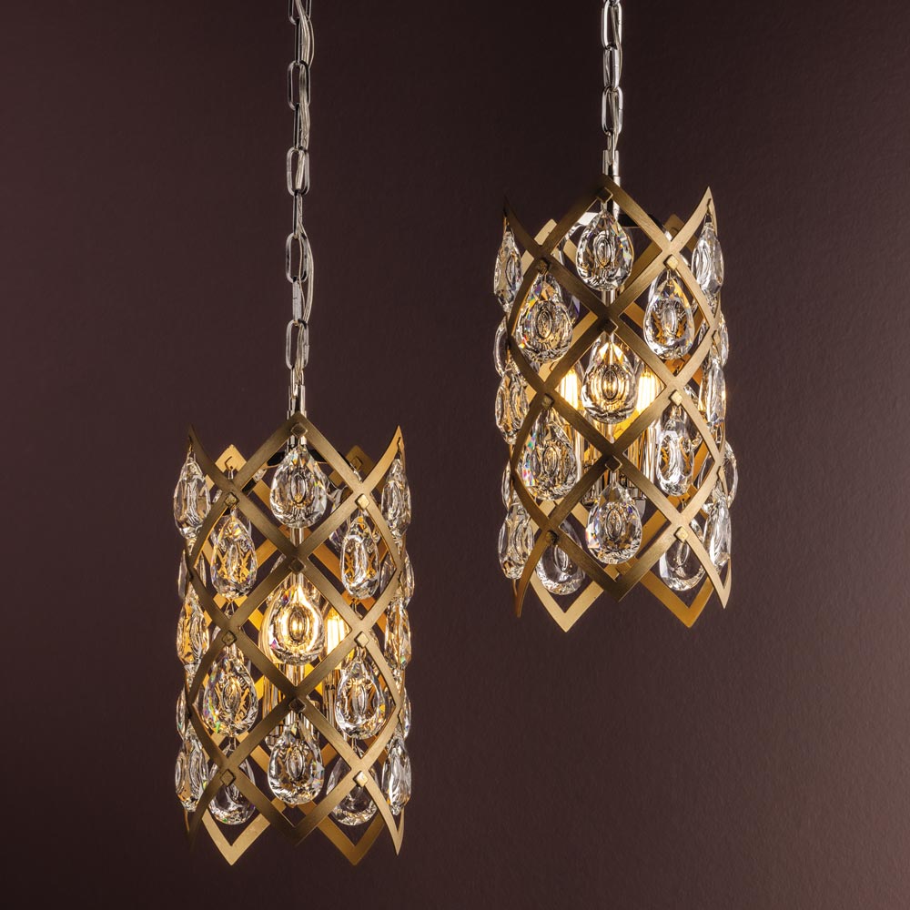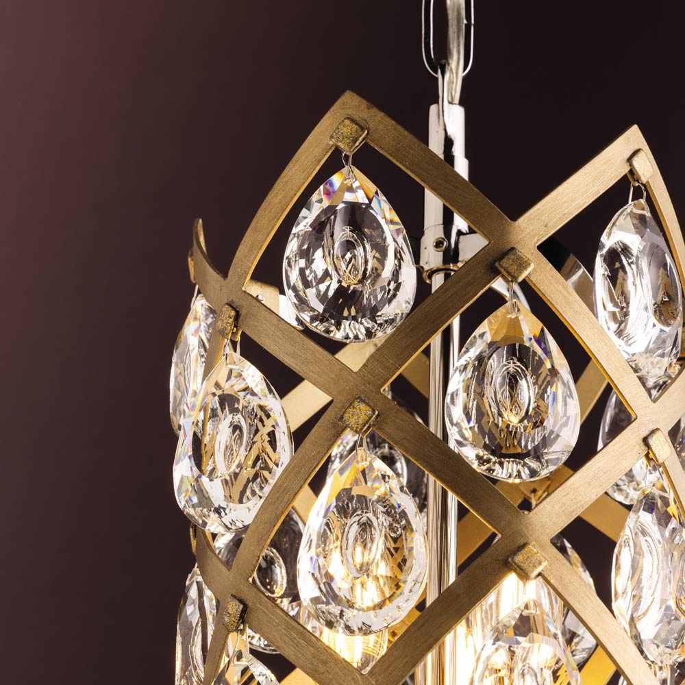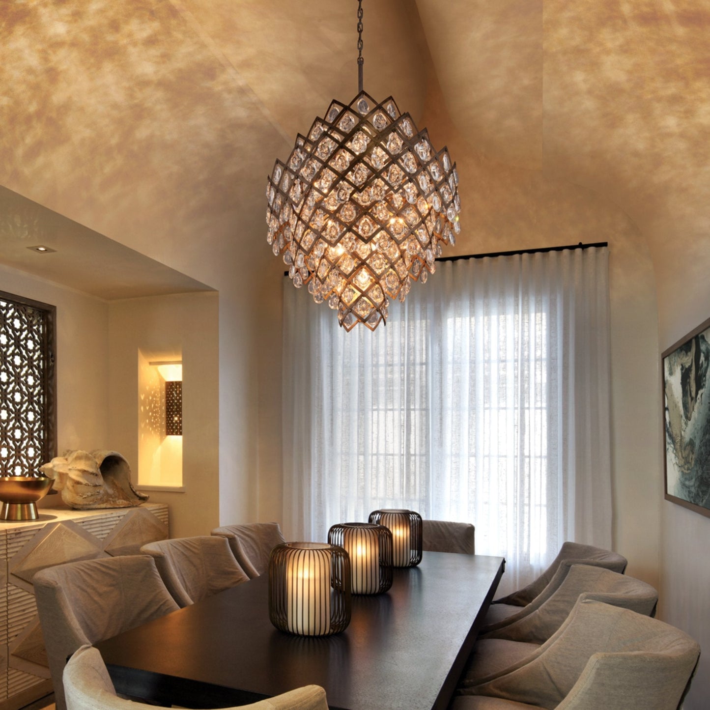 The crown jewel of lighting makes itself at home as the Tiara Pendant Light from Corbett Lighting, offering royal elegance with a lattice frame made of bronze finish metal and ornate clear crystal faceted accents serving as a diffuser.