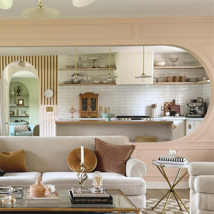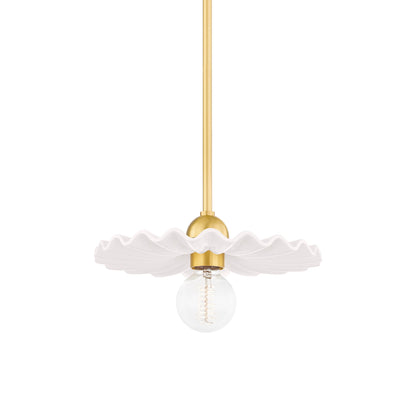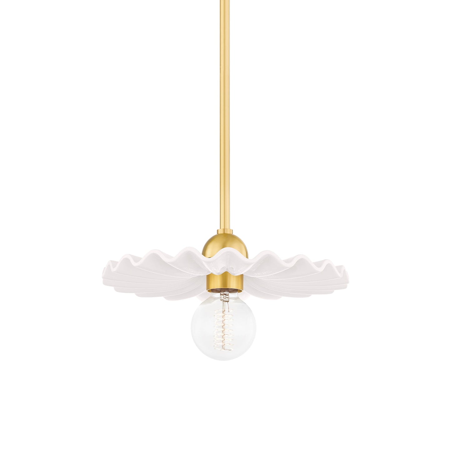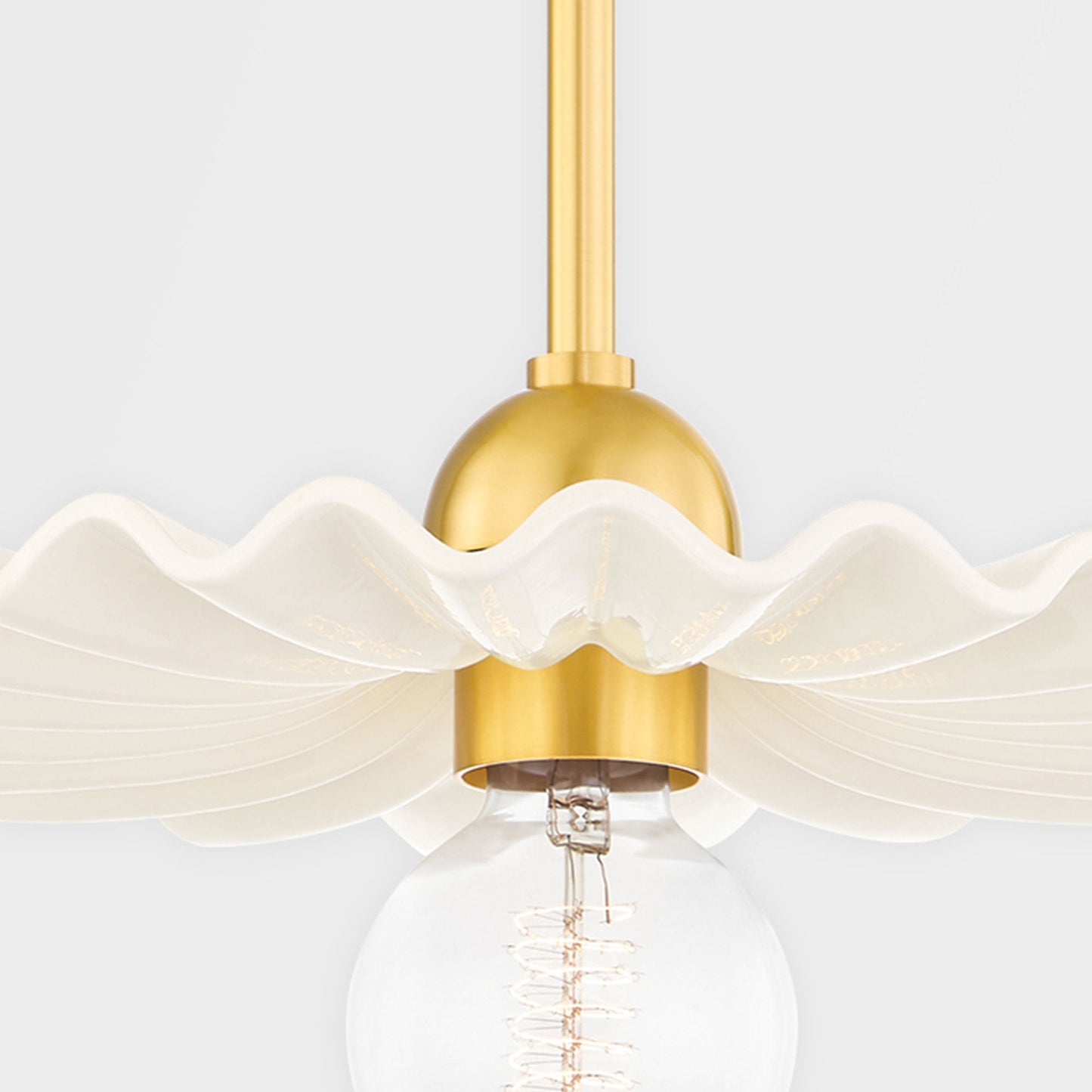 A pleated collar crafted in ceramic brings feminine energy and bold texture to the Tinsley Pendant Light from Mitzi. A combination of glossy white and aged brass creates contrast, offering a compelling addition to the decor in any room.