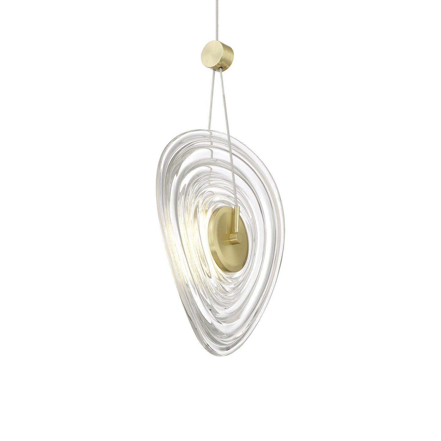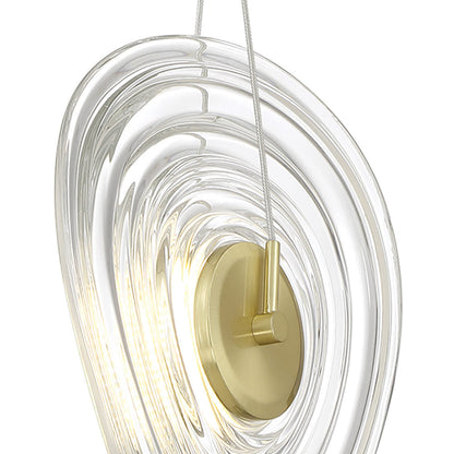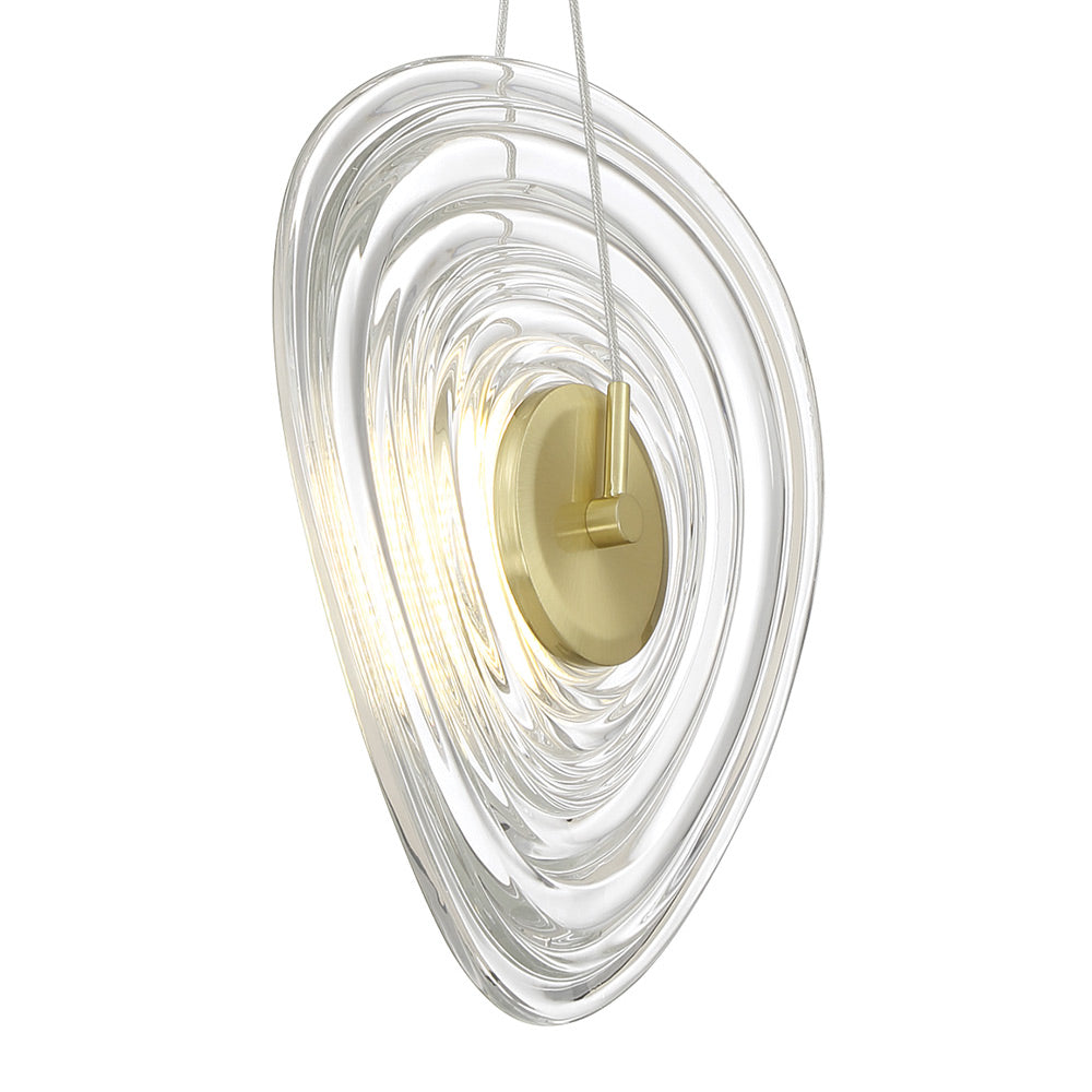 Undulating rings of clear pressed glass bring artistry and elegance to the TOPKNOT LED Pendant Light from George Kovacs. Striking in its elegance, the pendant is complete with a brushed gold finish suspension that adds warmth to the cool glass, creating dynamic tension and contrast that elevates any living or dining space.