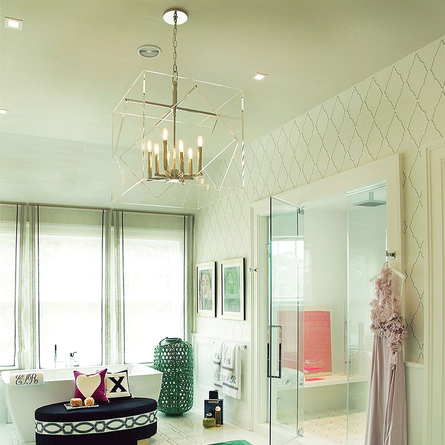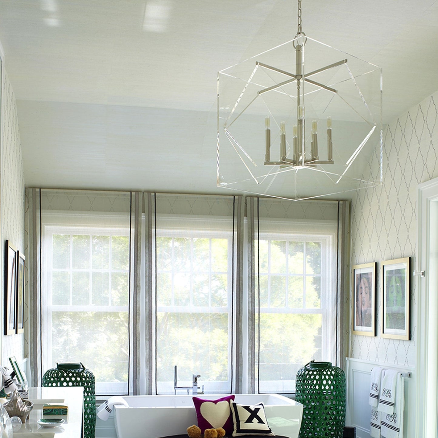 The pleasing simplicity of Travis's cube shape with diamond cutaway, along with its sophisticated contrast of materials—acrylic and metal—make it a perennial darling. Its transparent sheen allows you to see various features of the room while its shapes make a playful design impact. By using modern materials on a tightly scaled chandelier, Travis offers a postmodern take on a Hollywood Regency style.
