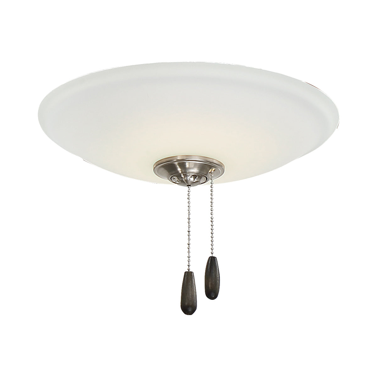 Choose the Universal K9115L LED Fan Light Kit from Minka Aire to turn an existing ceiling fan into one with a tempting dose of taste and utility. Indulgent etched white glass creates a saucer-style shade capped with an ornate metal accent. Energy-efficient lighting adds a bonus feature in a light kit with pull-chain operation and dimming functions.