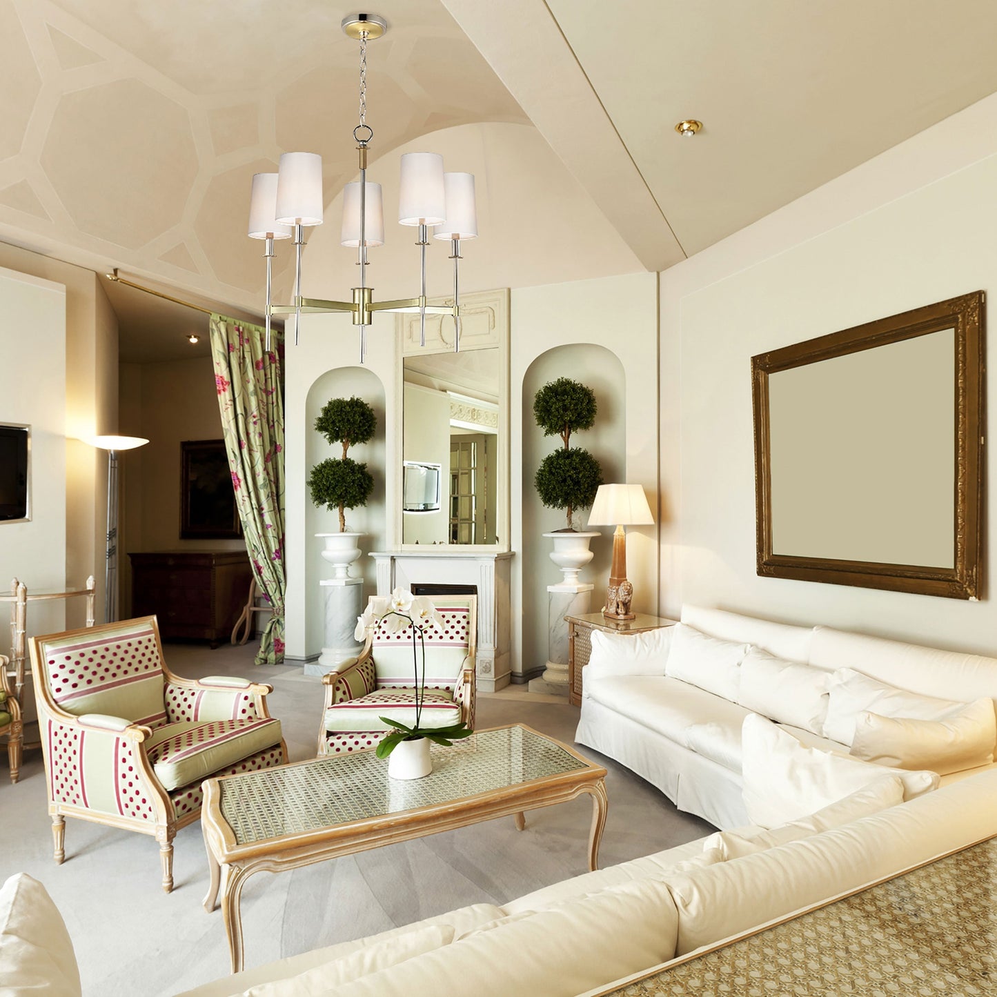 Elongated tails and candle sticks create effortless sophistication in the Uptown series. The slender candles of Polished Nickel contrast the stout supporting arms finished in a soft Satin Brass. Tall Off-White fabric shades complement the updated classic design. The simplicity of this design allows it to pair with various traditional to contemporary stylings and many color themes.