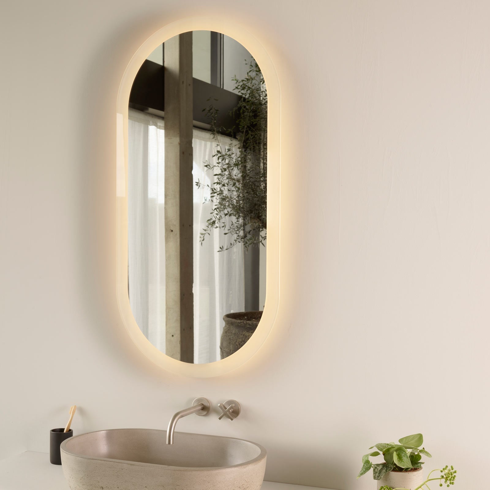 Bath spaces adopt a retro ambiance in the Varenna Stadium LED Illuminated Mirror from Astro Lighting, softening the high-tech LED lighting designed for even distribution. A focal point in any space, this mirror offers the stylish oval silhouette with sandblasted, chamfered edges and concealed LED modules with dimming functions.