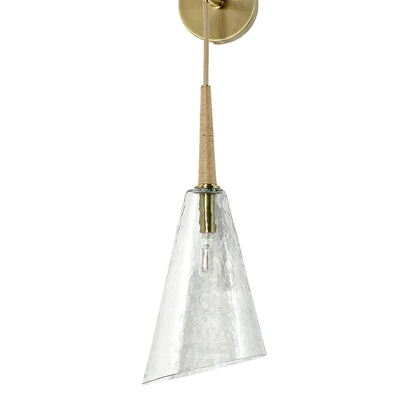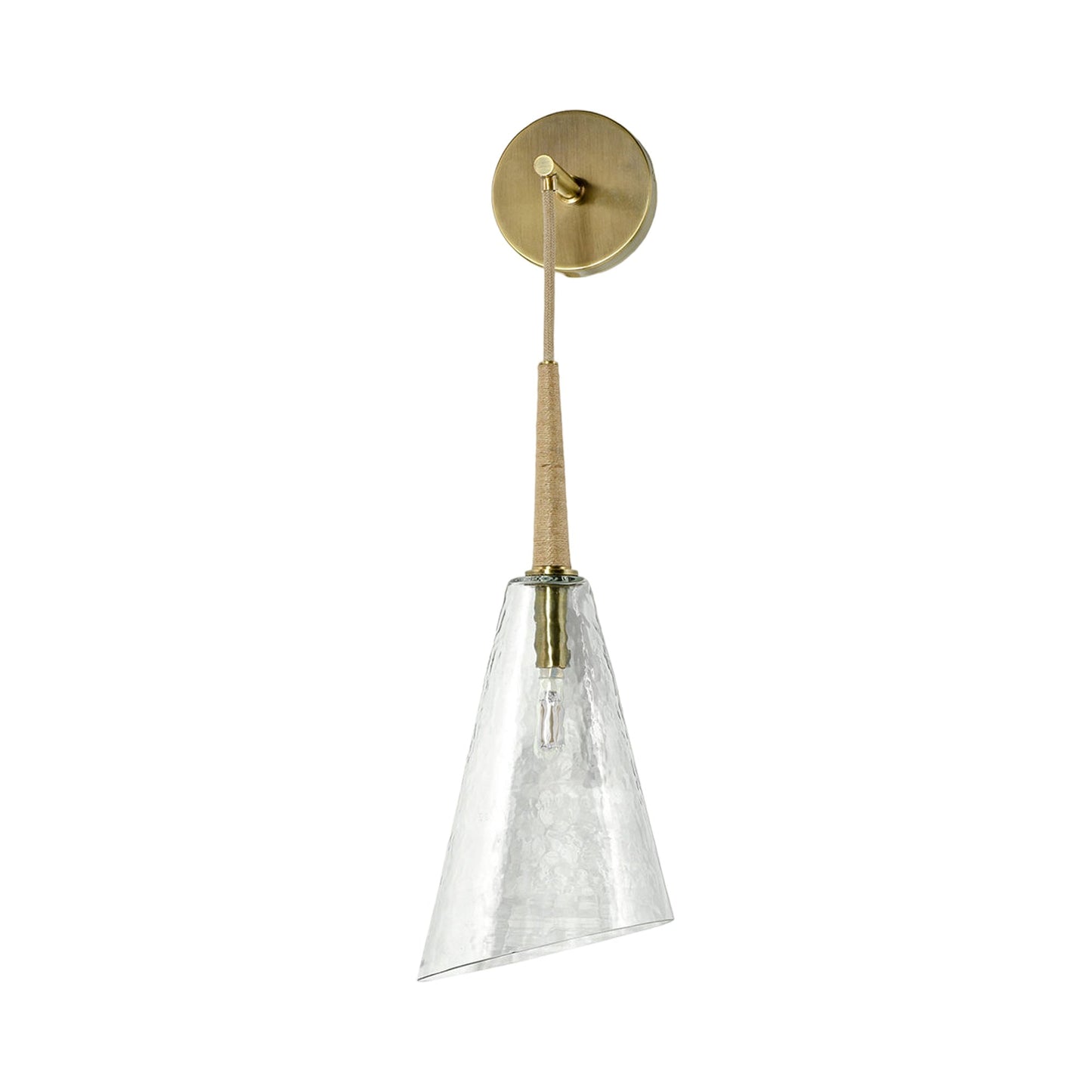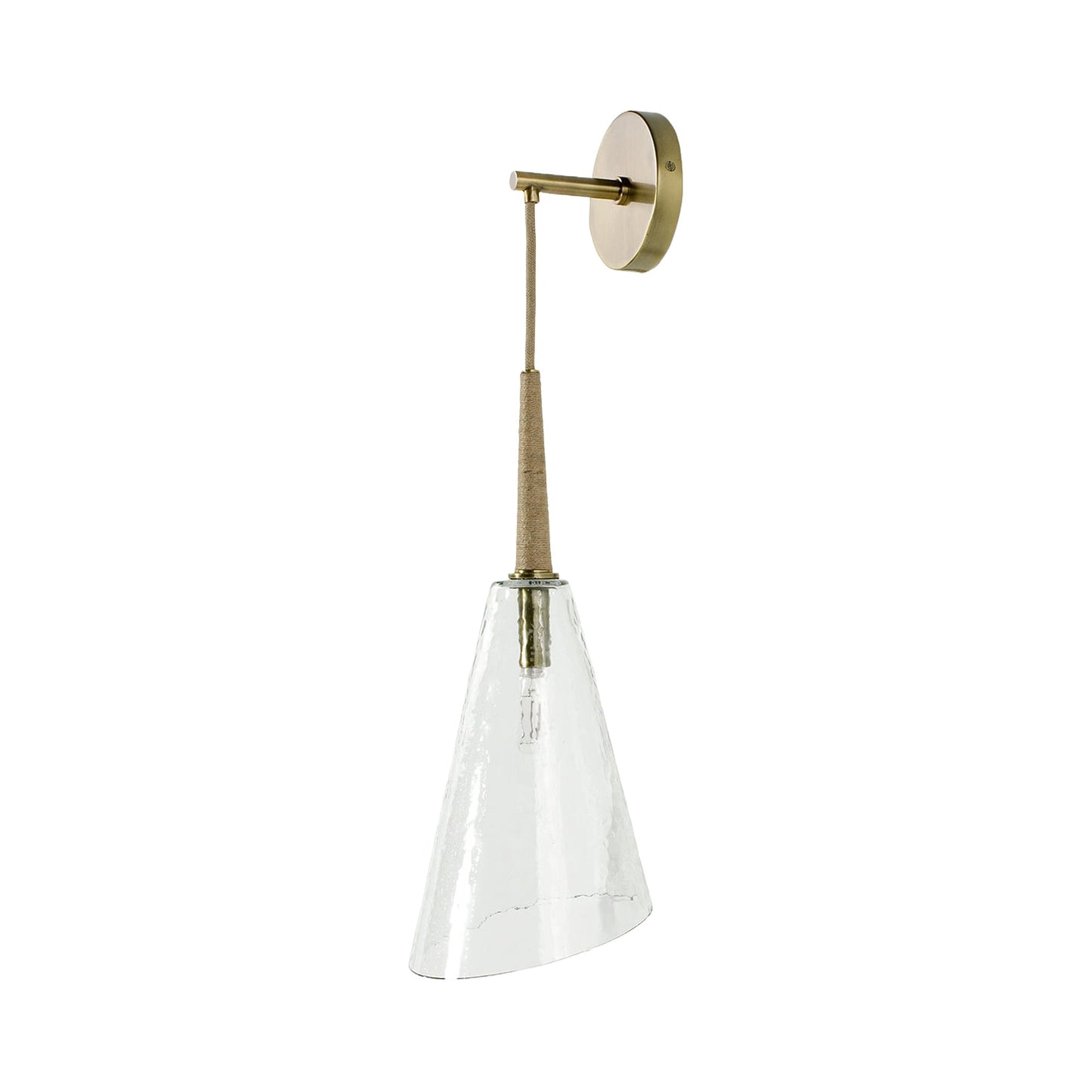 A gorgeous cone of glass is diagonally cut and accentuated with jute wrapping to bring coastal elegance to the Veraldi Wall Light from Palecek. The suspended pendant is displayed with antique brass finish details, perfect for a warm and inviting ambiance in virtually any living space.