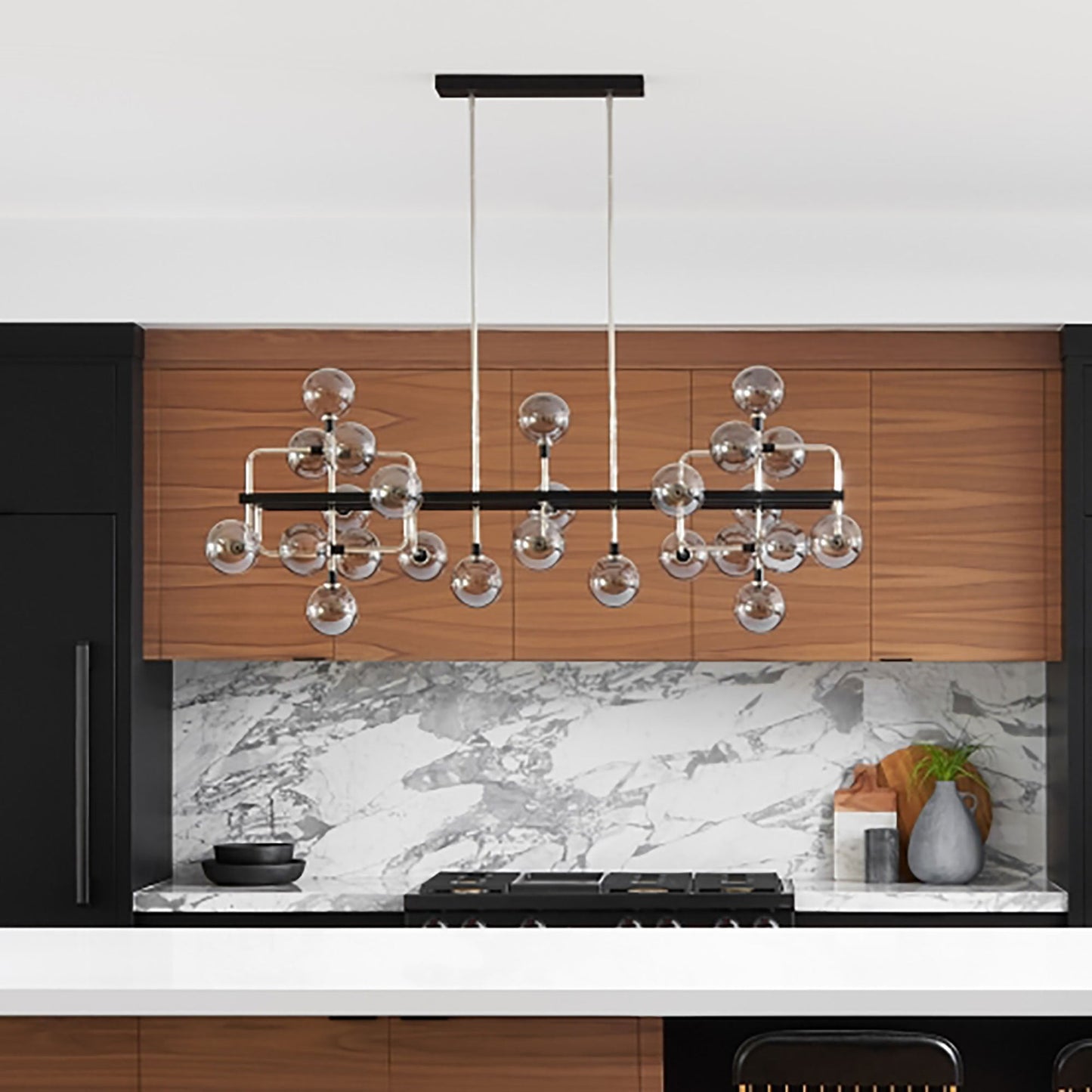 The Viaggio Linear Pendant Light by Sean Lavin for Visual Comfort Modern features an artistic cluster of glass orbs for a sense of celestial travel within a room. Your choice of two gorgeous finish options include a sleek black body contrasted against solid Brass arms with white glass globes or polished nickel arms with mirrored smoke glass globes, either option will create a comfortable glare-free wash of illumination onto surfaces below. The Viaggio Linear Pendant Light is ideal for dining room lighting, living room lighting and commercial lighting applications. The Viaggio can carry into other areas of your space as this collection is available as a chandelier, flush mount and wall sconce. Available lamping options include fully-dimmable energy efficient LEDs or no-lamp, leaving you the option to light the Viaggio with your preferred lamping.