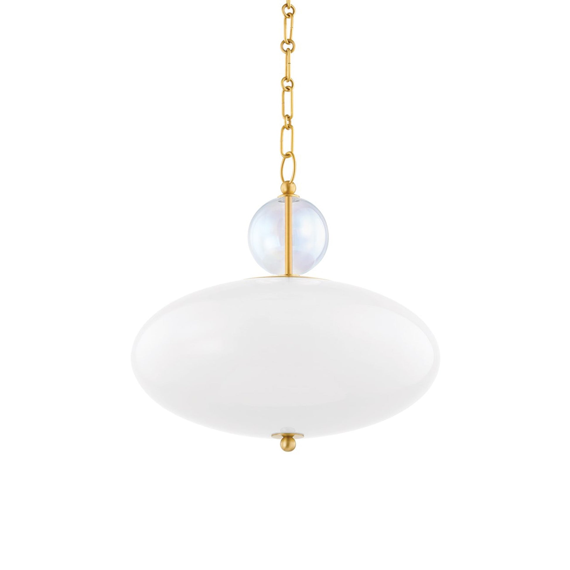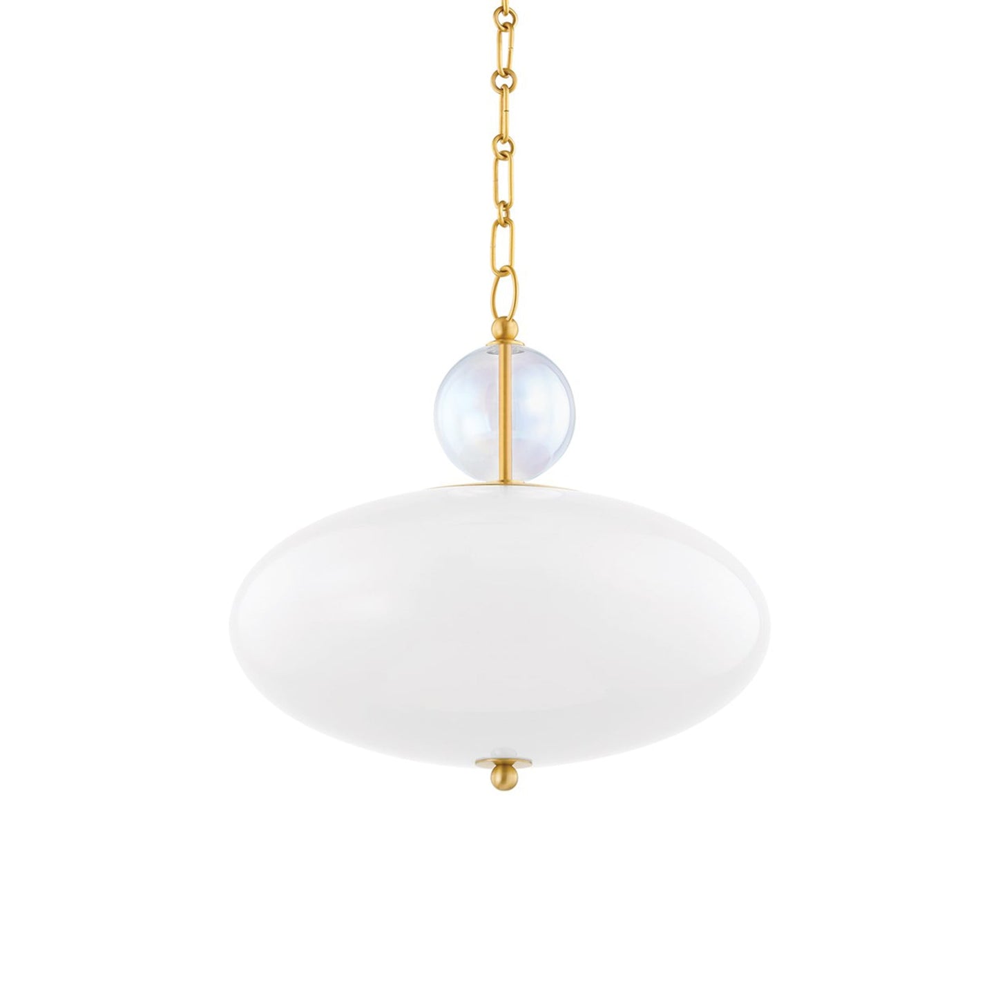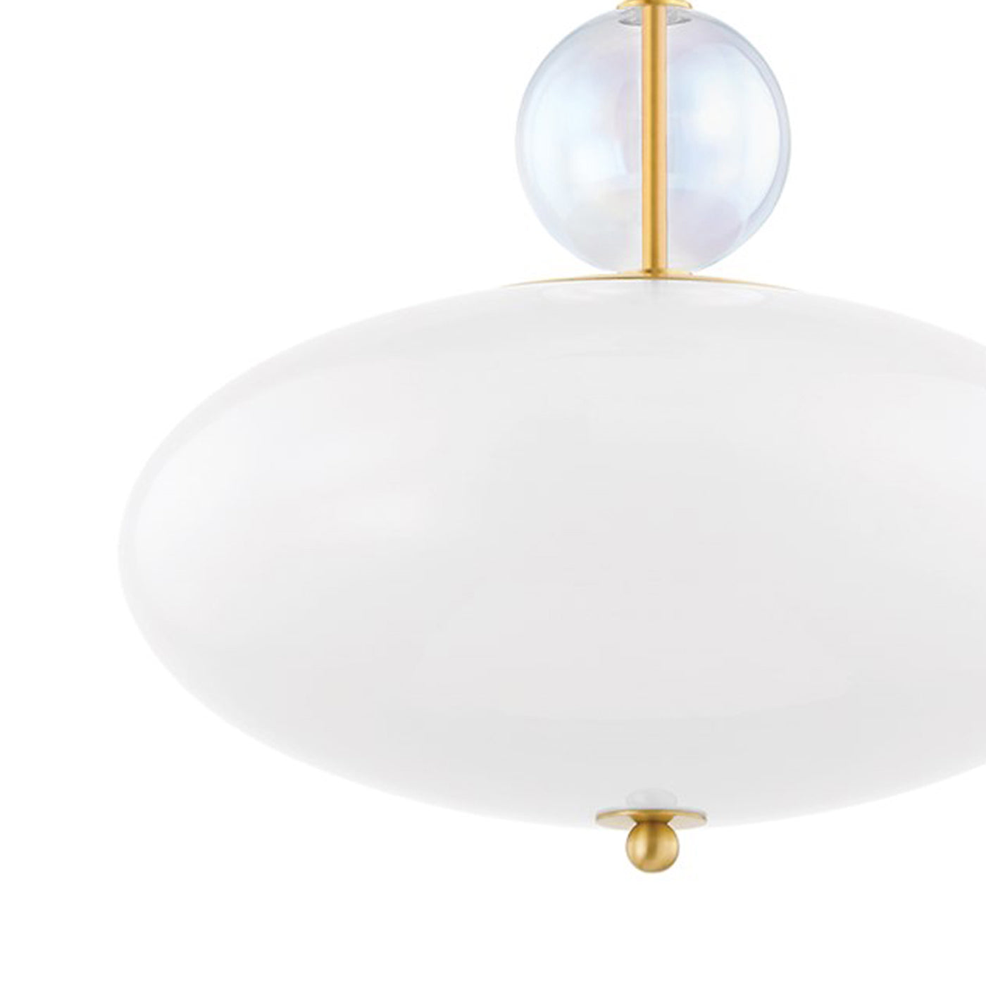 Quirky silhouetting plays into artistic hands in room design as the Viviana Pendant Light from Mitzi delivers a fashionable mix of organic essence and decadence. Romance ensues when an iridescent globe accent tops an exaggerated oval opal glass shade, as an aged brass chain sneaks in gleaming elegance. This striking fixture becomes a conversation piece with its gallery influenced persona.