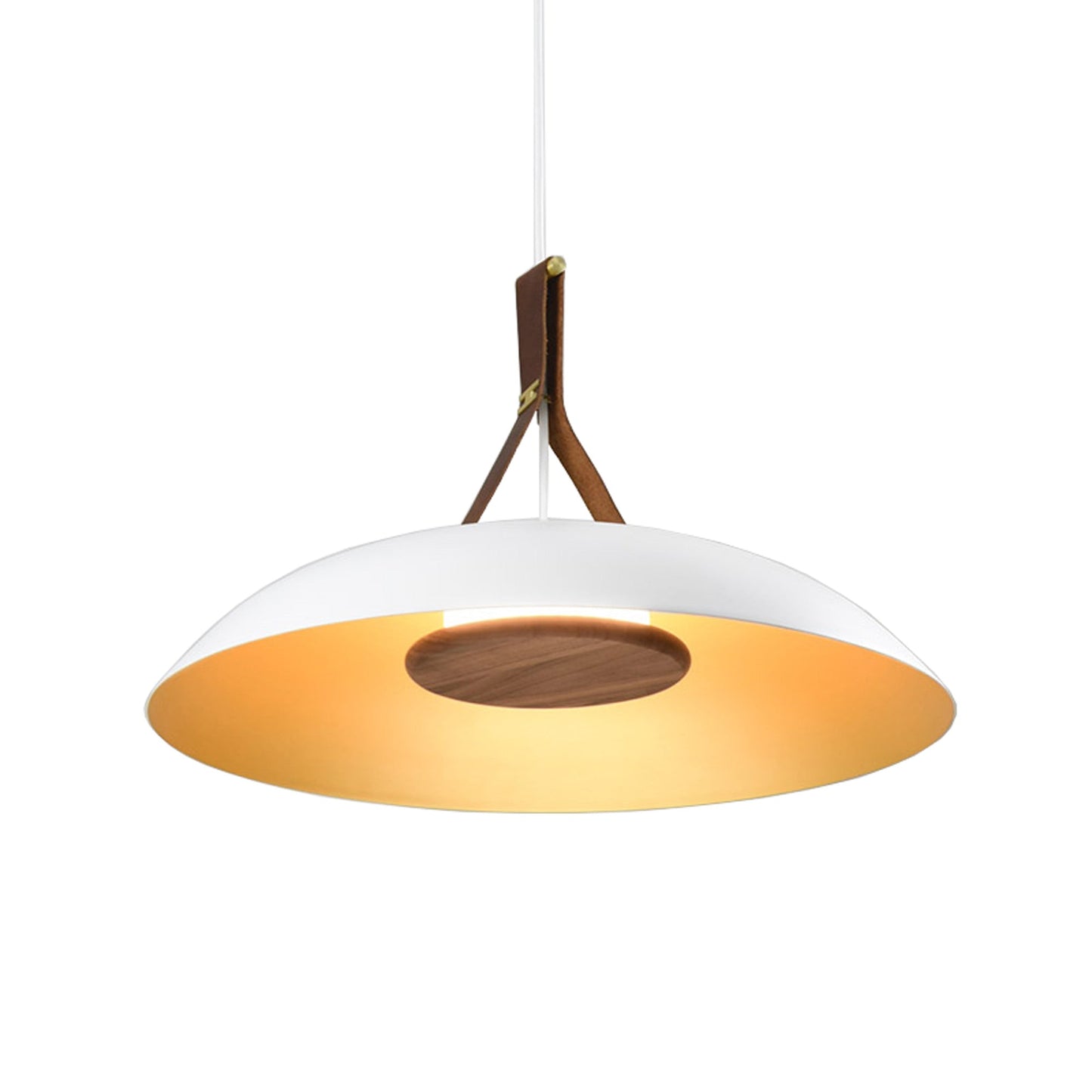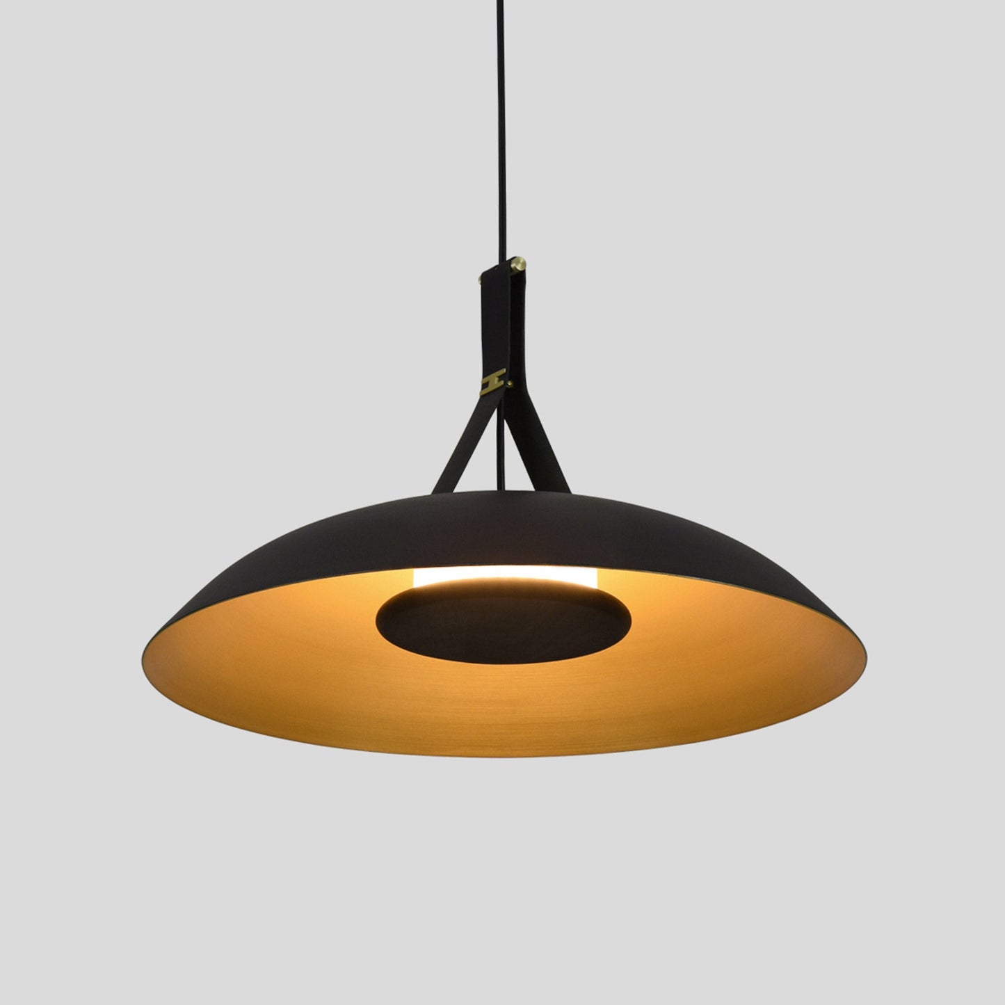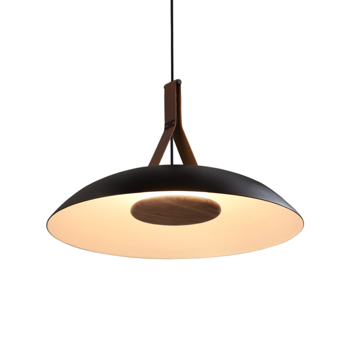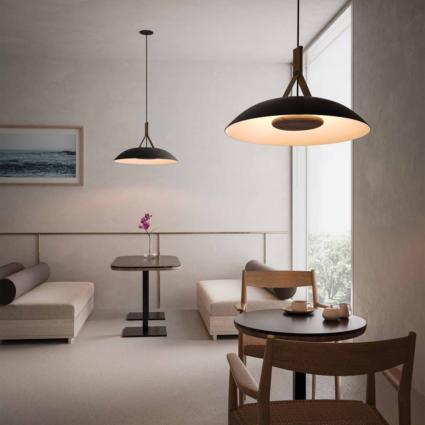 Dramatic attitude follows a sleek circular silhouette that stands out in the Volo LED Pendant Light from Cerno. A blend of natural materials composes a space-inspired version of industrial aesthetics in a fixture offering energy-efficient lighting in a modern living room, reading spot, or dining space.