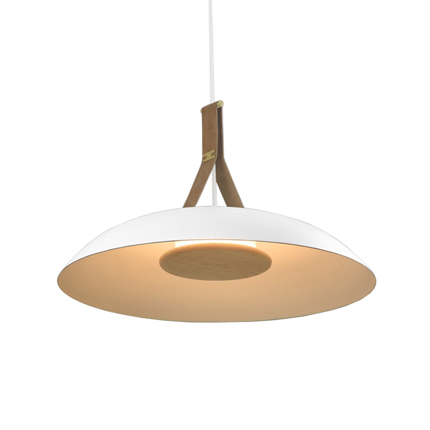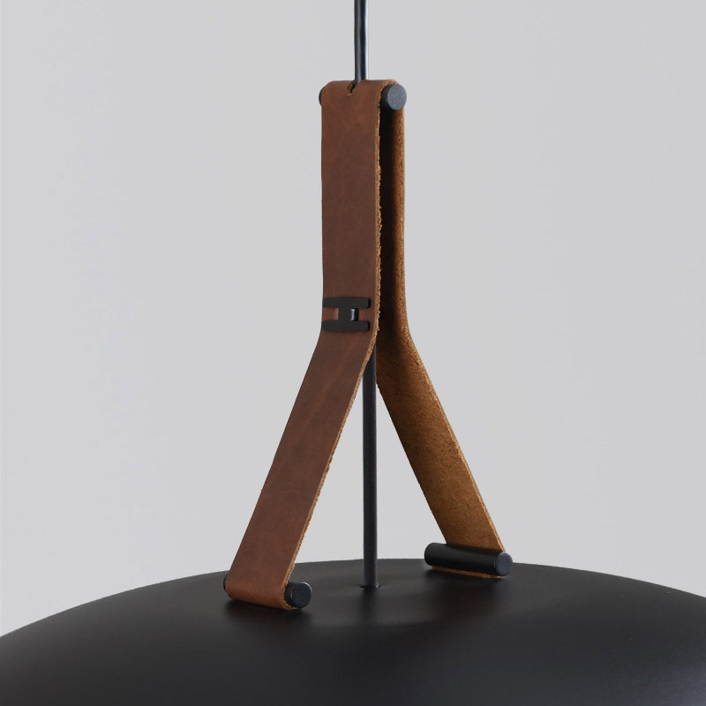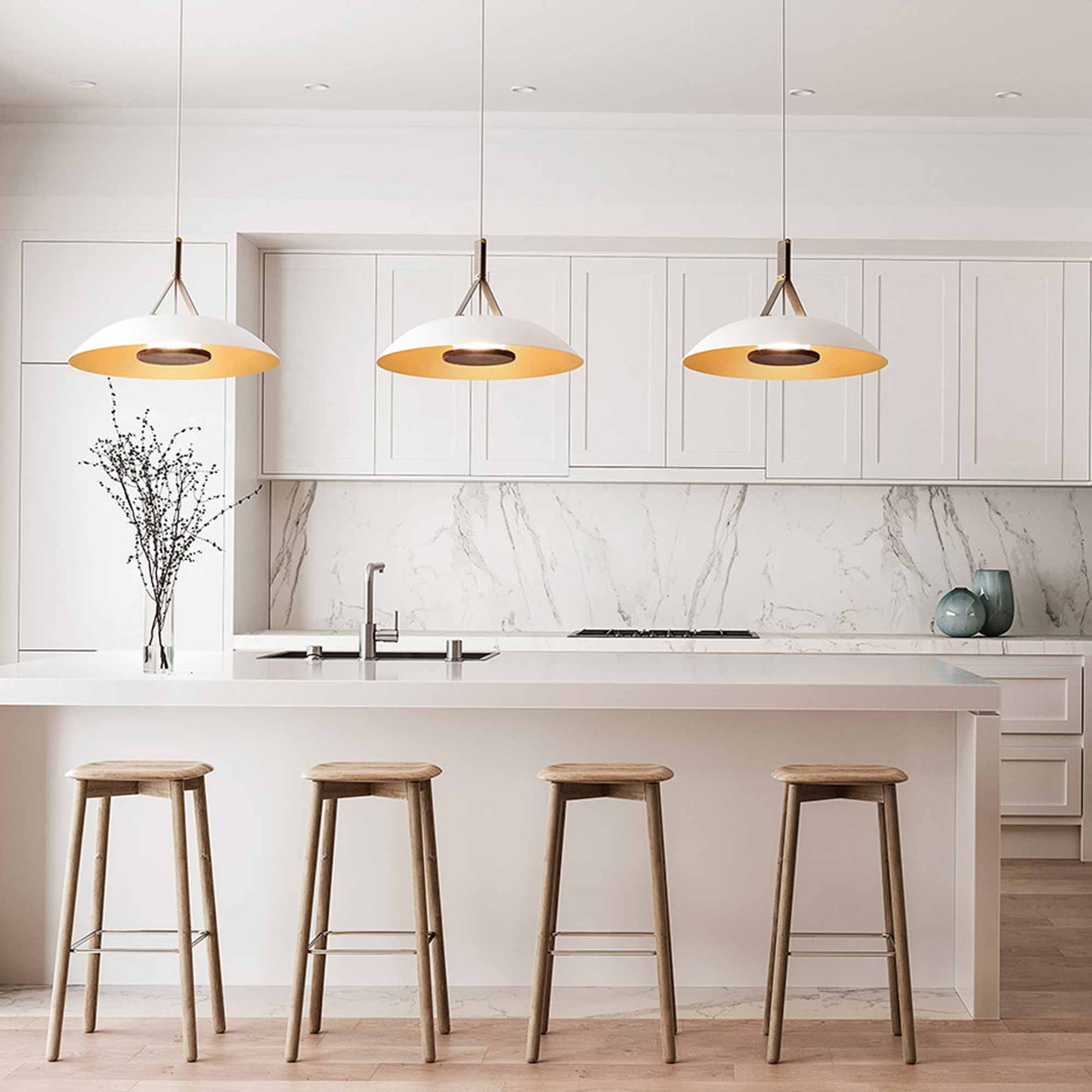 Dramatic attitude follows a sleek circular silhouette that stands out in the Volo LED Pendant Light from Cerno. A blend of natural materials composes a space-inspired version of industrial aesthetics in a fixture offering energy-efficient lighting in a modern living room, reading spot, or dining space.