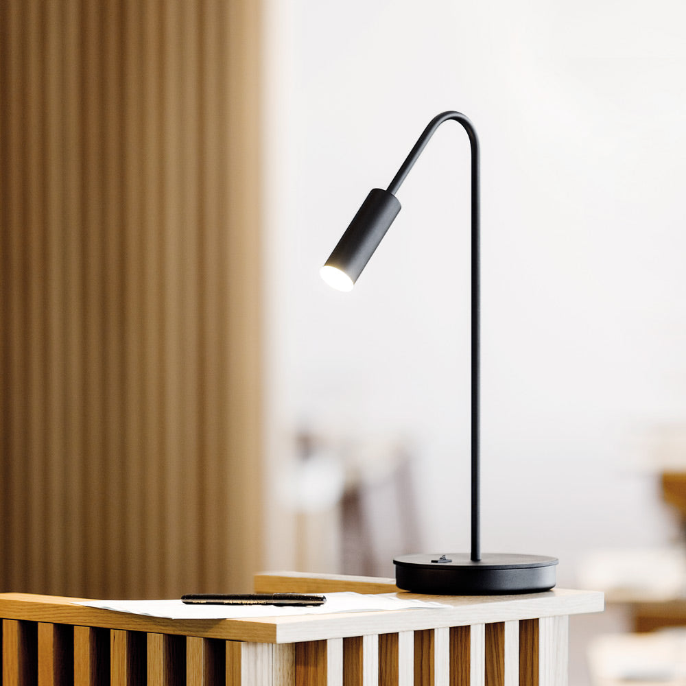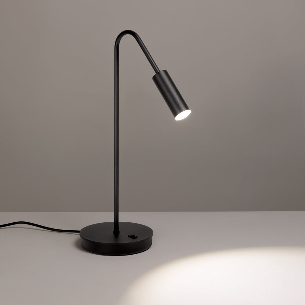 Softly poised and effortlessly elegant, the Volta LED Table Lamp from Estiluz features a slender matte-black shaft that gracefully supports a gentle, curved elbow and an illuminated cylindrical head. The warm, intimate light spills through an acrylic diffuser, offering a soft glow that transforms the ambiance of any room. With its refined yet simple design, this table lamp evokes both serenity and sophistication, perfect for reading nooks, desks, or bedside tables.