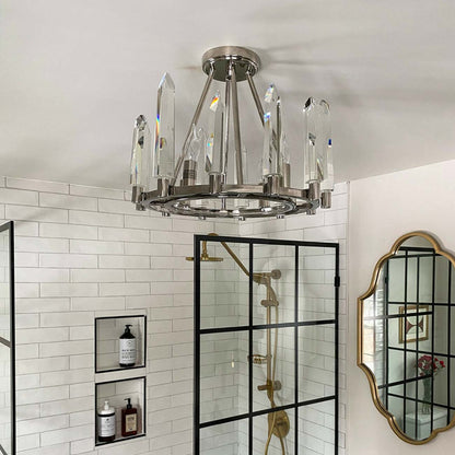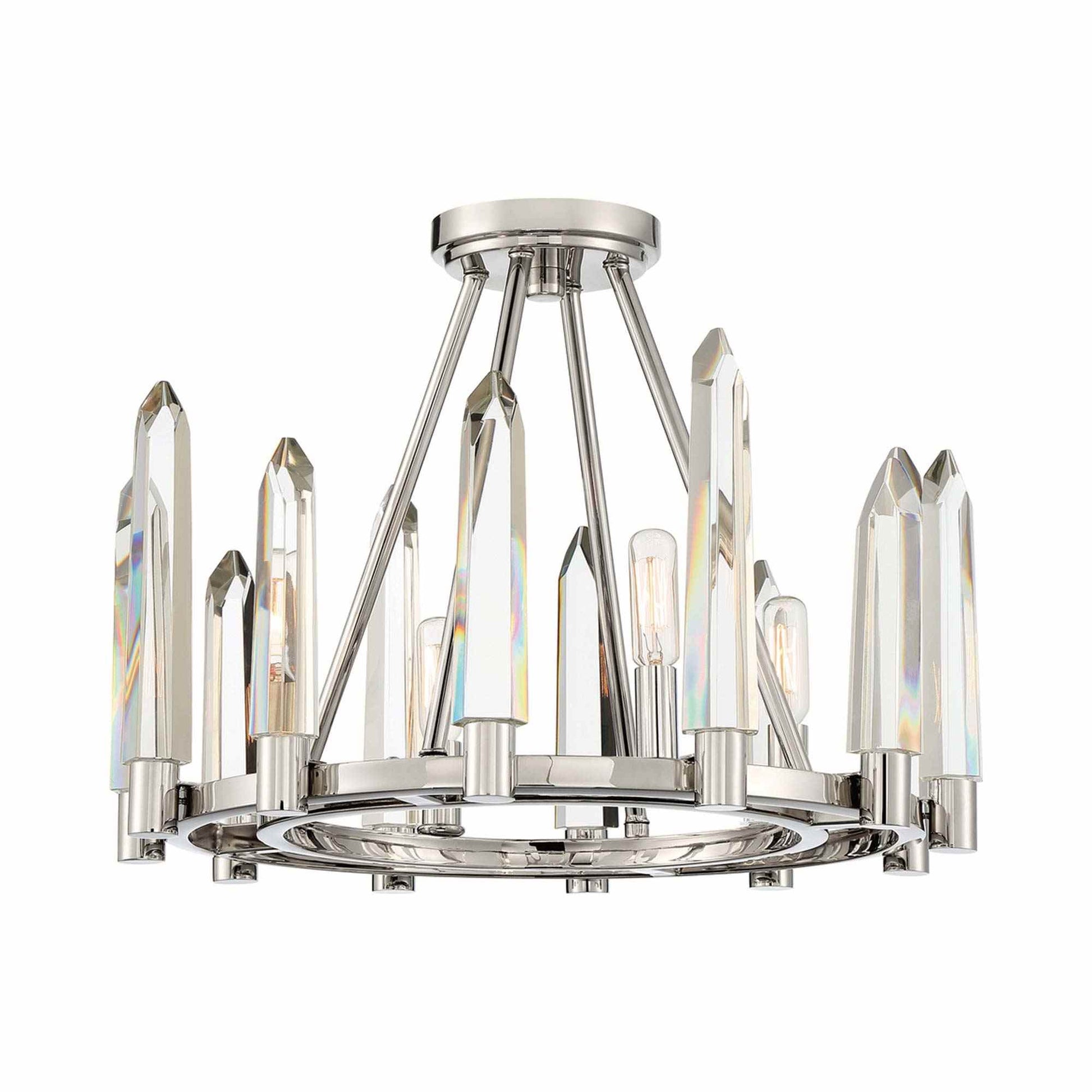A ring of decadence and irresistible contemporary elegance awaits as the Watson Semi Flush Mount Ceiling Light from Crystorama delivers the sparkling, exquisite appeal you're seeking. Tasteful and somewhat subtle in its decadent look, this circular fixture mounts faceted hand-cut crystal towers onto a polished nickel metal frame, infusing unmatched modern style to lift the ambiance in a dining area or foyer.