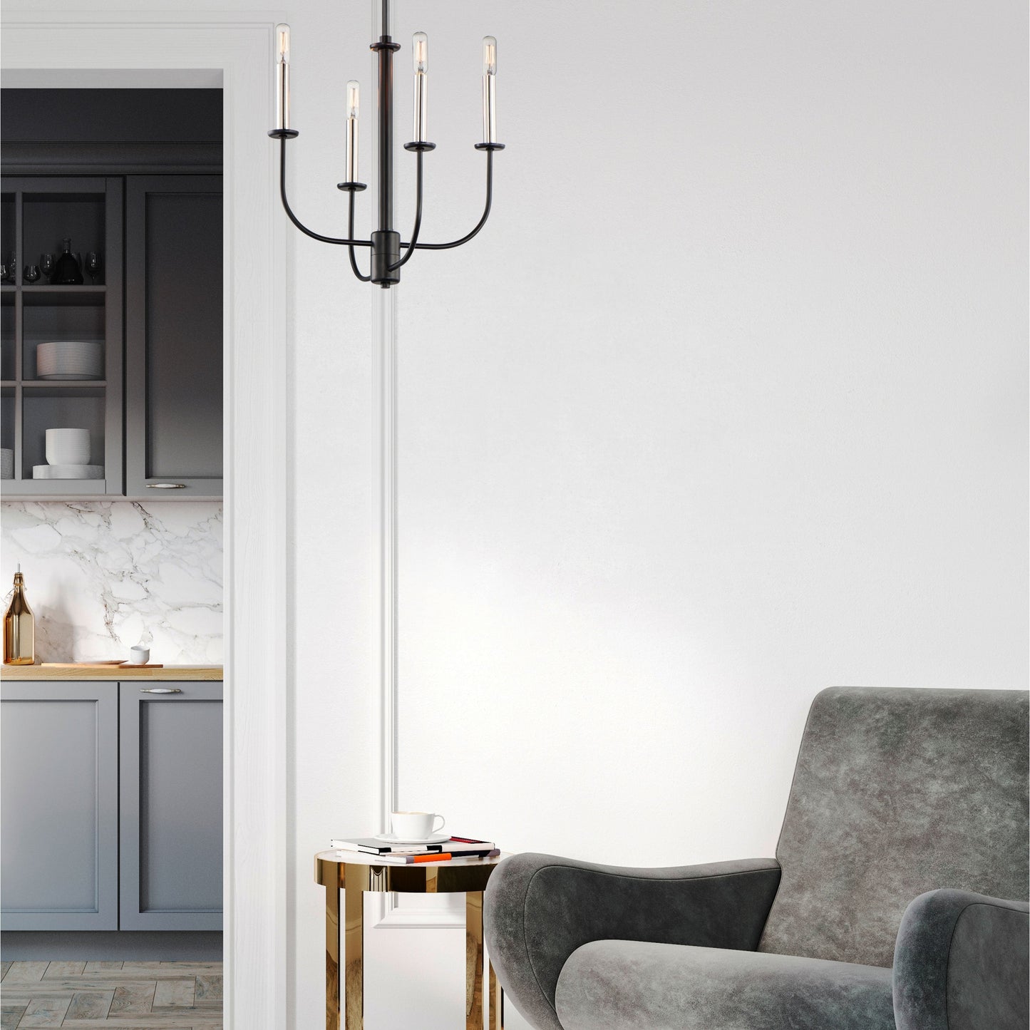 Arms sweep upward from an adjustable collector to create a minimal yet stately design. Available in black, satin brass, and satin nickel, this collection provides a transitional look for a variety of settings.