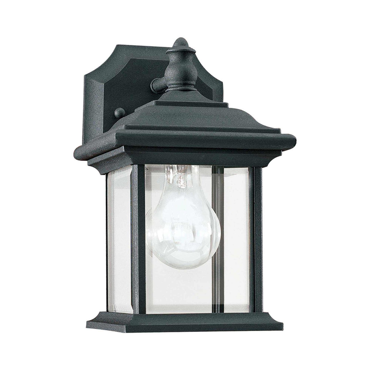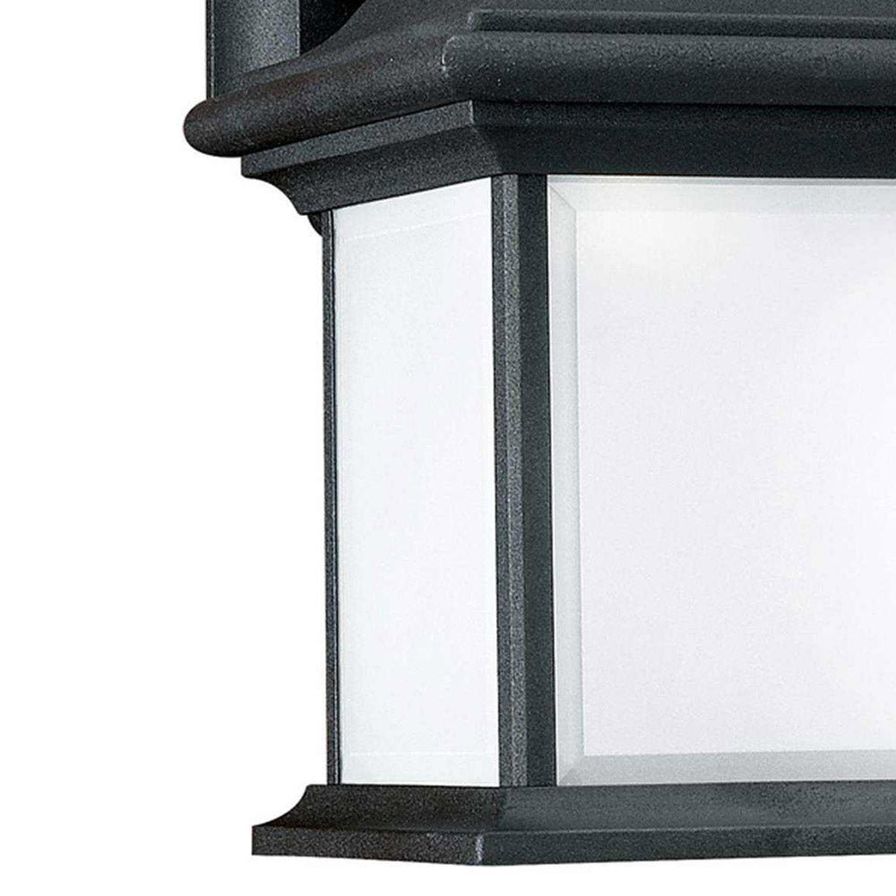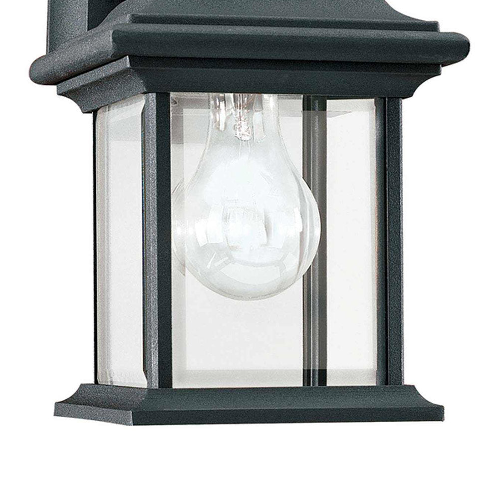 Design detail lifts the mood in a timeless lantern motif as the Wynfield Outdoor Lantern Wall Light from Generation Lighting embellishes a commercial or residential structure. Beveled aspects on black metal framing and glass panels match a tiered roof design on its bold black metal frame, creating the ultimate in sophistication.