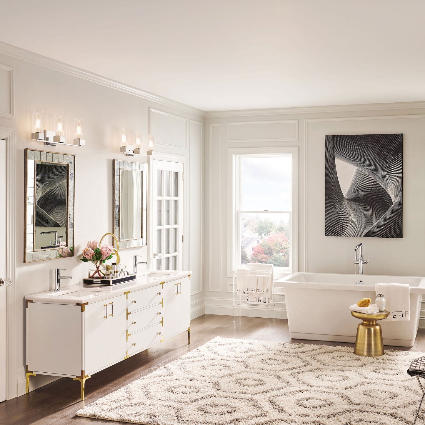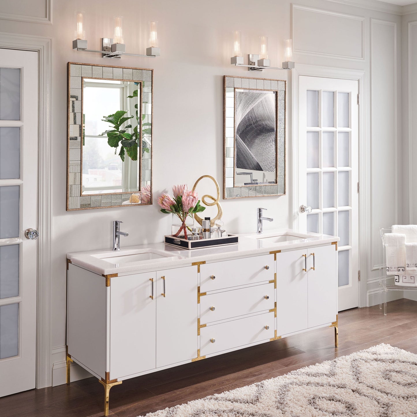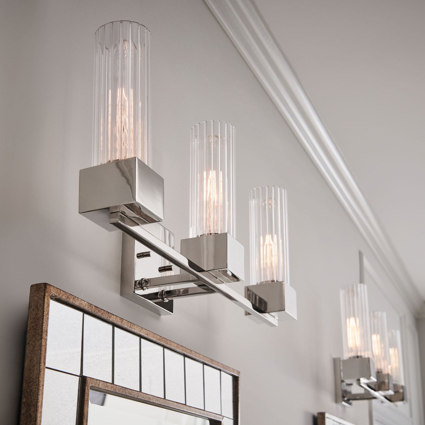 A cubed base design that is definitely not square! The crisp, contemporary lines of Xander Bath Vanity Light pair perfectly with elegant ribbed clear glass to create a throwback style statement that is most definitely updated and upscale. Pick Polished Nickel or Heritage Brass finish to set the bar high when it comes to a modern vintage masterpiece.