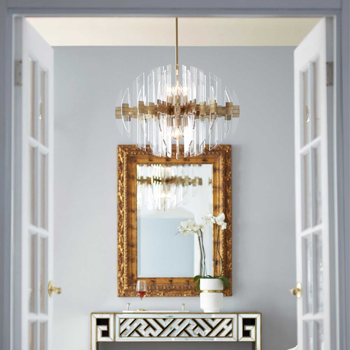 The sleek and futuristic Zion Pendant. Available in three size and three finish options (Aged Brass, Satin Nickel, & Polished Nickel), this fixture is ultra modern but thanks to its transparent design it also serves as the perfect transitional accent to any type of style. This acrylic luminary is the perfect complement to any Modern, Minimal, or Mid-Century Modern entry or dining room application.